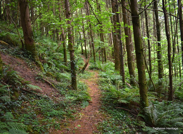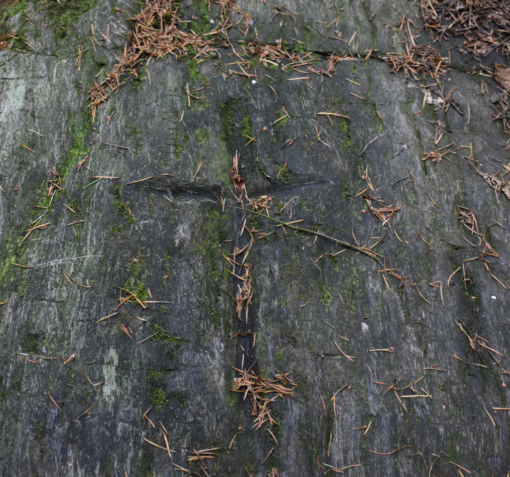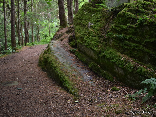 This unusual site is located in a lovely woodland setting in Mulmountry townland, just off the Brownscastle Road. It presents as a natural cleft in the bedrock, which has a sloping bed-like appearance.